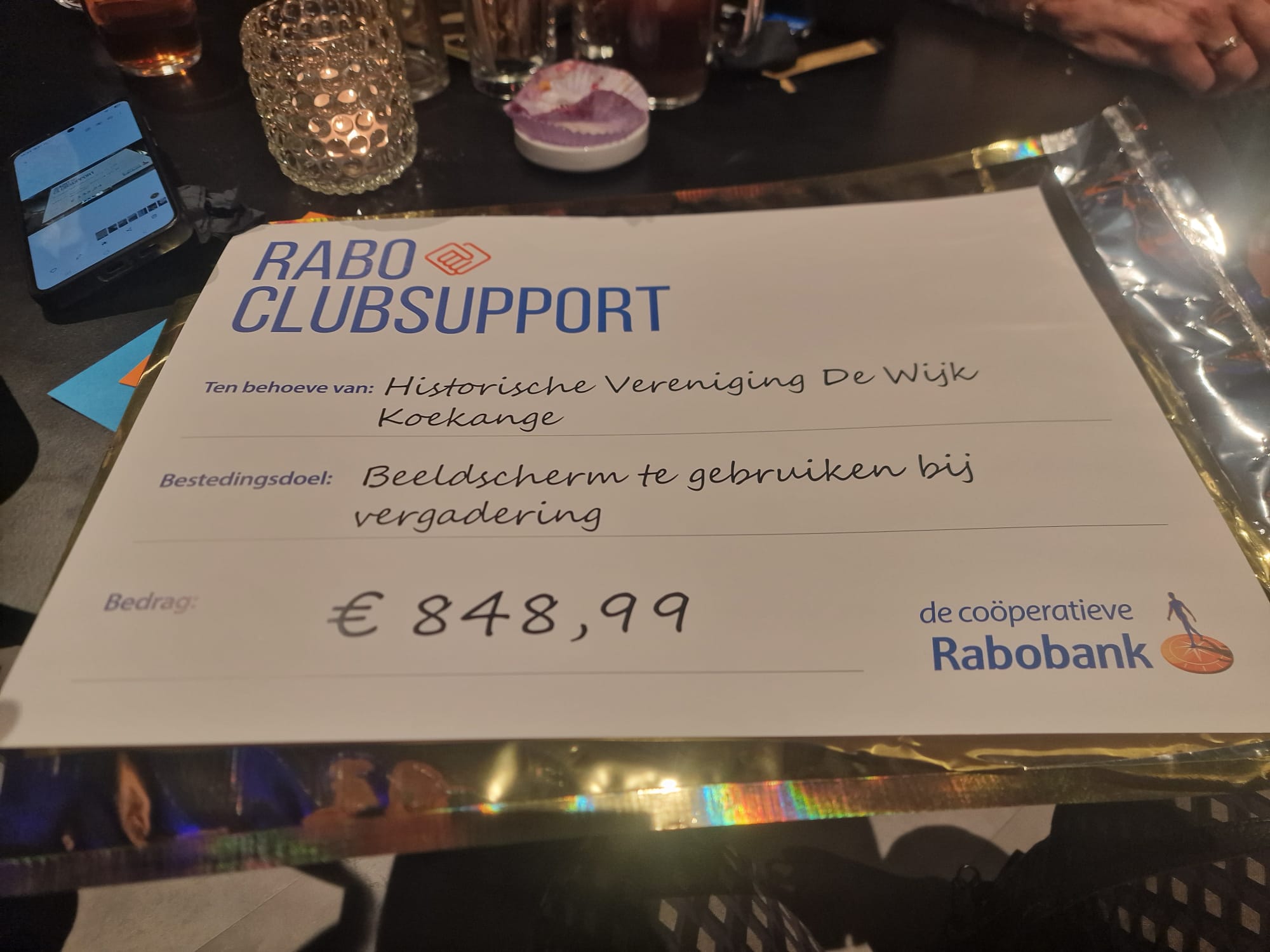 Namens de Historische Vereniging de Wijk-Koekange wil ik jullie hartelijk bedanken voor de massale steun die wij van jullie hebben mogen ontvangen tijdens de RABO CLUBSUPPORT van 4 tot en met 26 september 2024. Op 4 oktober 2024 overhandigde de heer Koos Oetsen namens Rabobank ClubSupport een cheque aan penningmeester Annie van de Berg. Dankzij jullie steun hebben wij het mooie bedrag van € 837,89 mogen ontvangen van de Rabobank. Hiermee kunnen wij de Historische Vereniging verder laten ontwikkelen. Dit jaar zullen we de Oudheidkamer voorzien van LED-verlichting en extra armaturen in de opslag. U kunt de activiteiten van de vereniging volgen middels de website, Facebook en ’t Olde Karspel.